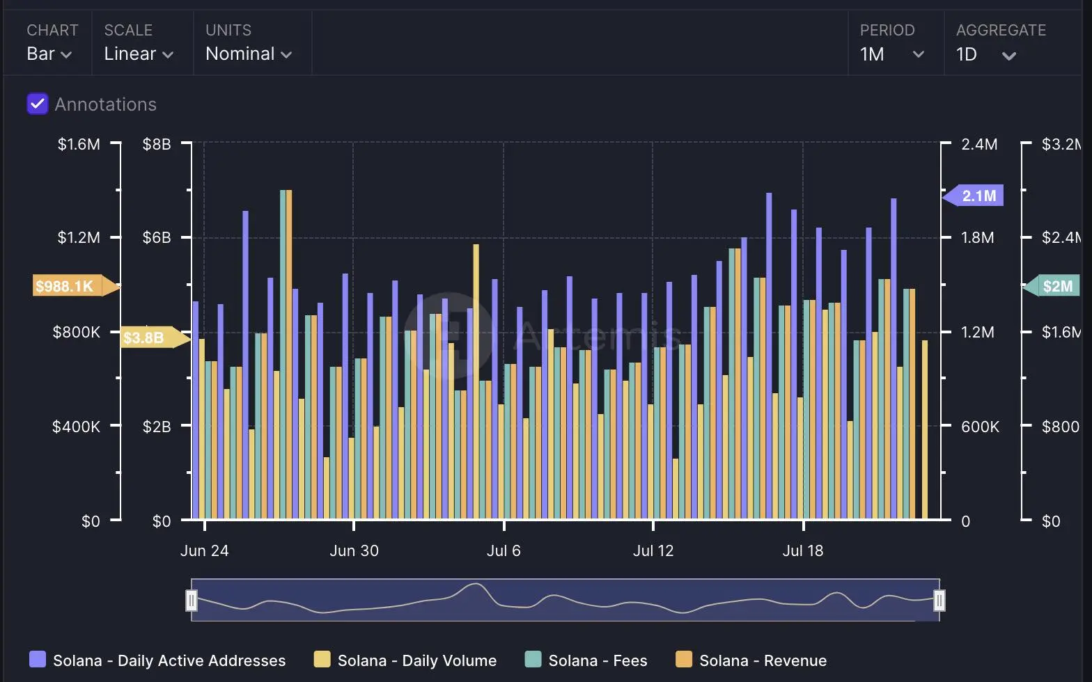 同时,Artemis 数据显示显示,过去一个月,Solana 日交易量增长了 40.5% 至 4370 万美元;每日活跃地址数则上涨 75%,达到 210 万个,主要来自钱包、MEME 和跨链桥板块,且新增用户地址数占比更高;TVL 上升至 52 亿美元,涨幅约为 26.9%;日交易费用增长超 33.3% 至 200 万美元,日收入也上涨了超 33.1%,钱包、DeFi 和 MEV 为主要贡献板块。