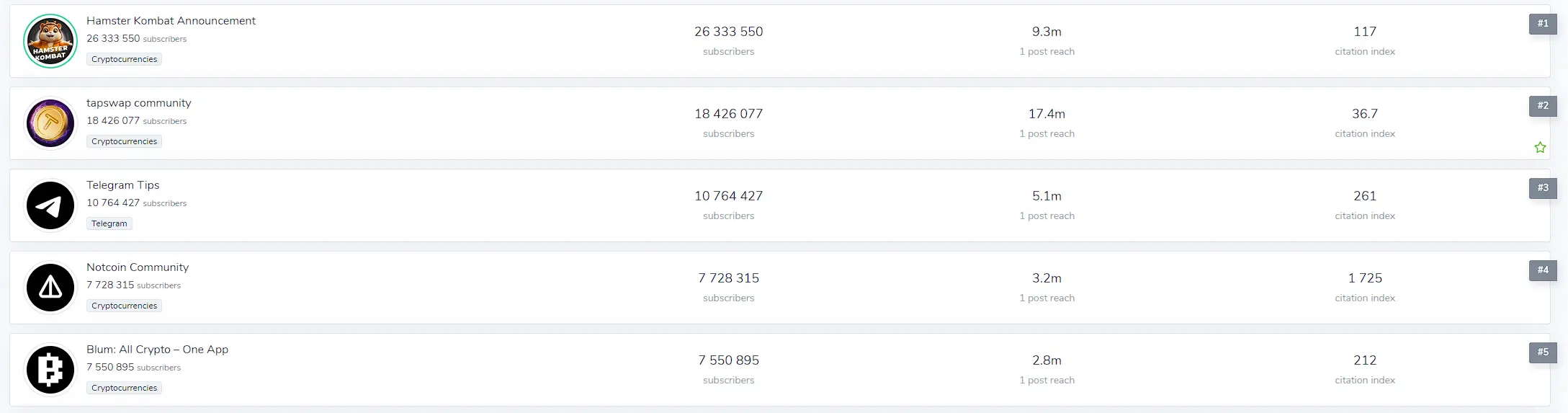 近期,在 TON 生态的点击屏幕小游戏迎来爆发潮。除了 Notcoin 之外,Hamster Kombat、tapswap 等小游戏也都突破 3000 万用户。在 Telegram 全球前 10 的频道中,目前已有 5 个是加密社区频道。其中,Blum 是近期快速崛起的一个社区,目前频道订阅人数超过 763 万,单月增长 660 万订阅者,已位列 Telegram 全球第五。