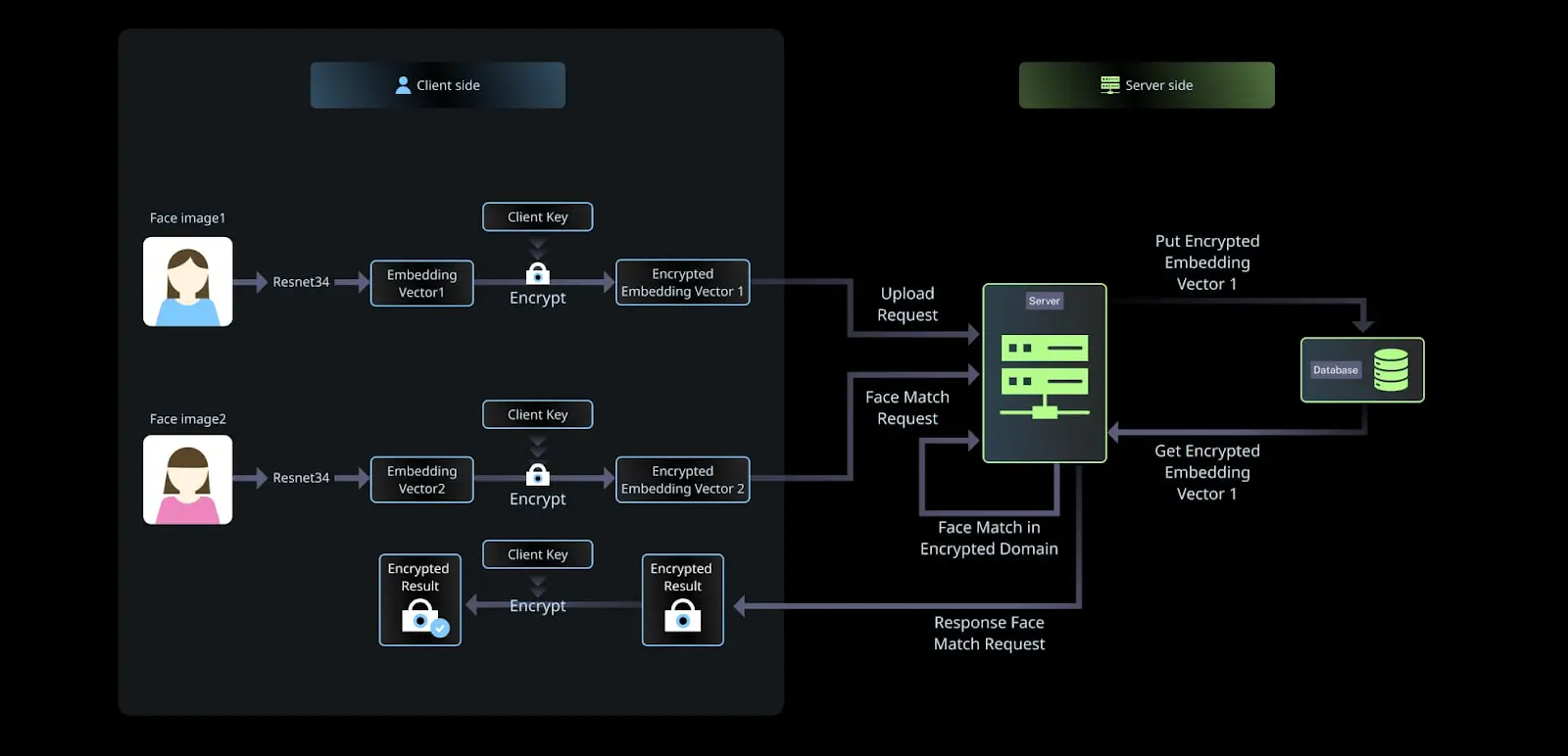 相比之下,Privasea在设计上更加注重用户隐私保护。Privasea的DApp“ImHuman”采用FHE技术进行用户身份验证,不需要收集用户的面容或虹膜影像等敏感信息。验证过程完全在用户的移动设备上进行,面部向量数据被加密处理,不会传输到任何服务器。这样,Privasea在确保验证安全性的同时,也最大限度地保护了用户的隐私,避免了数据泄露的风险。