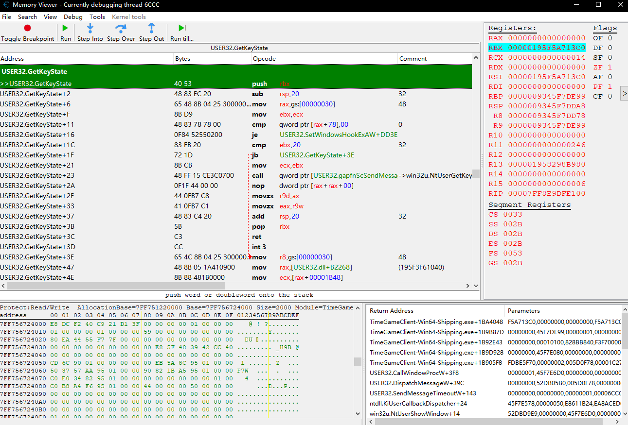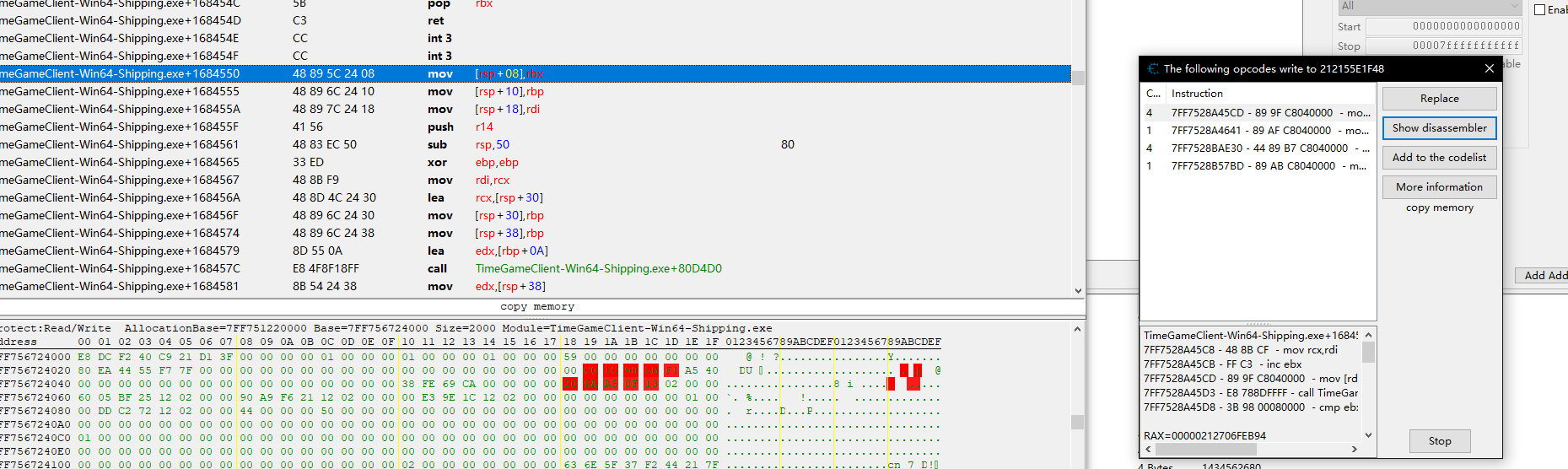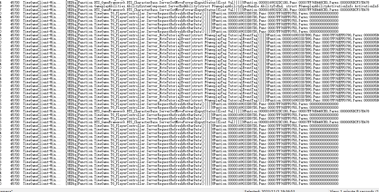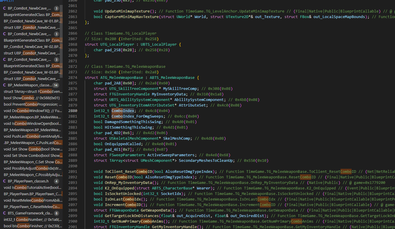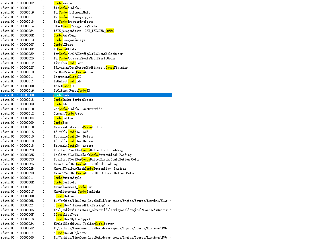 对于基于UE开发的MMO类型的游戏来说,篡改本地数据的收益很低,原因是UE有成型的同步机制,用于各个Actor和其他属性之间的同步以及服务端校验,但是通过分析游戏源码来看,很明显BigTime并没有将属性同步机制合理运用,还是有部分数据落地,例如Comboindex功能,通过对combo Index设置写入断点,可以找到写入函数,之后便可以对combo功能进行调试。(具体操作会影响公平性,不做演示)