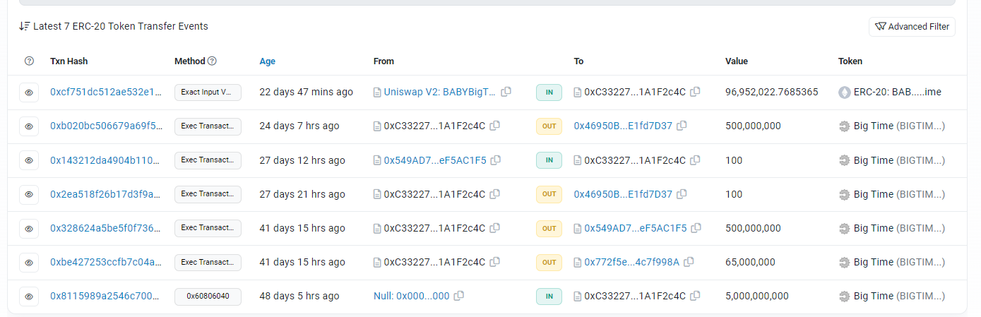 BigTime代币合约采用向多签名钱包Mint代币,然后采用固定供应量的方式进行部署。因为当前代币合约功能简单,所以合约的基础安全性是足够的。通过观察Owner钱包的Tx信息,可以看到Owner钱包再获取到代币以后向几个钱包分别转帐了部分代币。