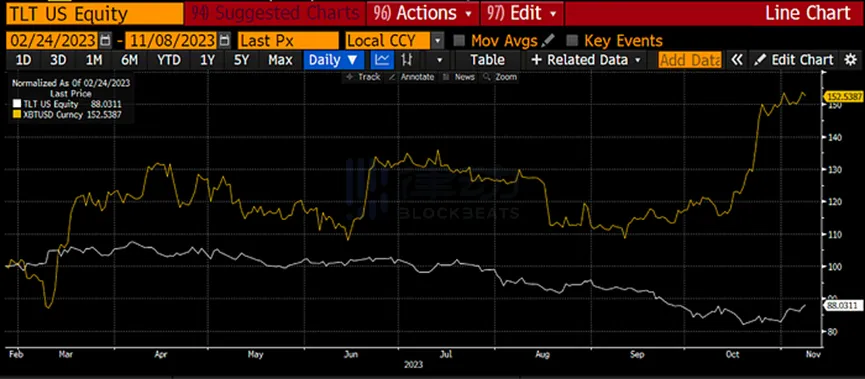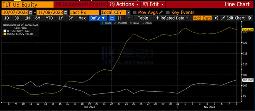 自哈马斯 / 以色列战争爆发以来,TLT 上涨了 3%,而比特币上涨了 26%。