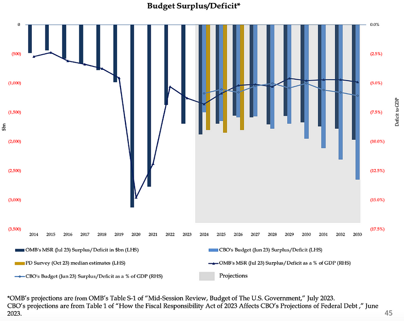 预计 2024 年的赤字将在 7% 至 10% 之间。在挥金如土的政府的推动下,美国经济将表现良好。因此,中等选民将对股市上涨、经济强劲和通胀低迷感到相当满意。