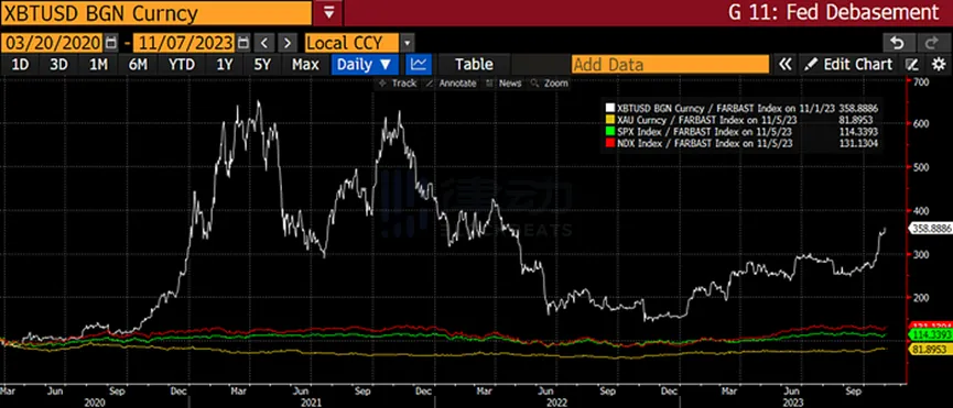 这是一张比特币 ( 白色 )、纳斯达克 100 指数 ( 红色 )、标准普尔 500 指数 ( 绿色 ) 和黄金 ( 黄色 ) 除以美联储从 2020 年 3 月开始以 100 为指数的资产负债表的图表。正如你所看到的,比特币在美联储资产负债表扩大的影响下,击败了所有其他资产 (+258%)。