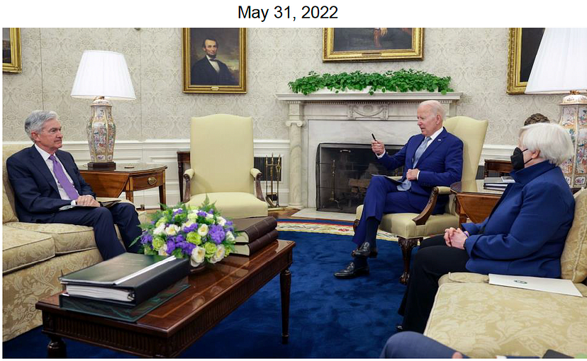 这是了解帝国高层权力动态的最重要的图片之一。拜登和 Yellen 指示「鸭子鲍威尔」不惜一切代价抗击通胀。