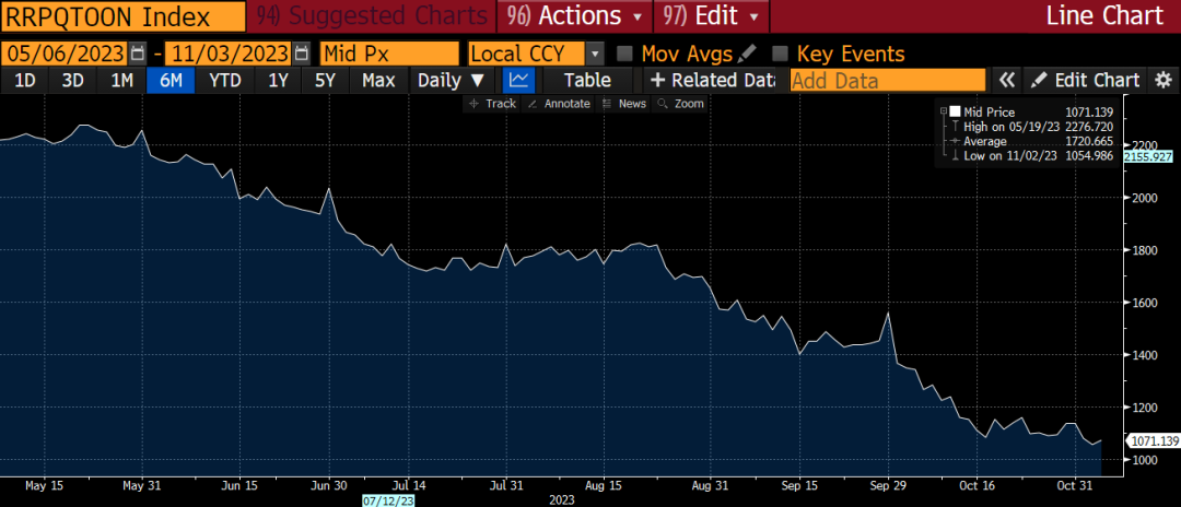 在最新的季度融资报告中,Yellen 承诺将增加国债发行量。有人可能会说,如果没有 2 万亿美元的 RRP,长期国债的抛售情况会更糟。请记住,今年 6 月初,在美国政界人士「令人震惊地」同意提高美国债务上限、允许他们花更多钱之后,Yellen 重启了借贷。当时,RRP 为 2.1 万亿美元。此后,Yellen 卖出了创纪录数量的国债,RRP 余额自那以来减半。