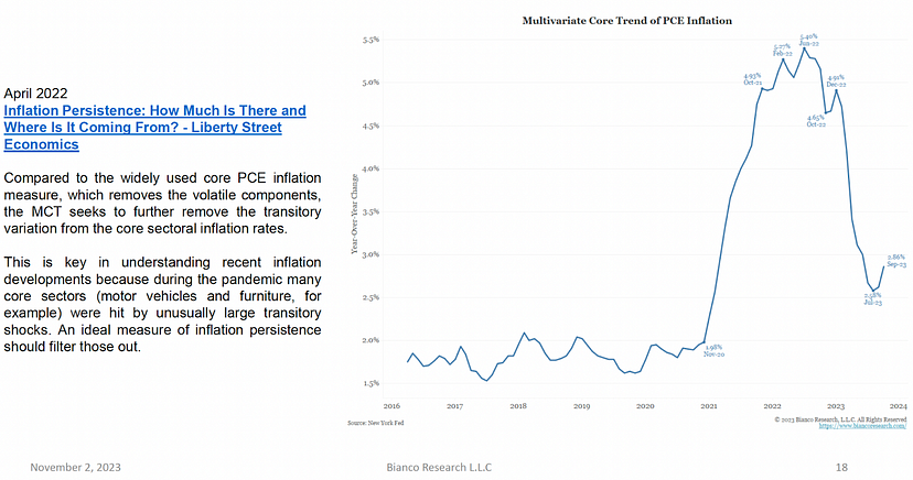 问题是所有这些被操纵的通胀指标都高于美联储 2% 的目标。更糟糕的是,这些指标似乎已经触底。如果美联储真的在对抗通胀,那么他们应该继续加息,直到他们的模糊通胀指标达到 2%。但突然间,鲍威尔在 9 月的新闻发布会上表示,美联储将暂停加息,以观察其加息行动的效果。