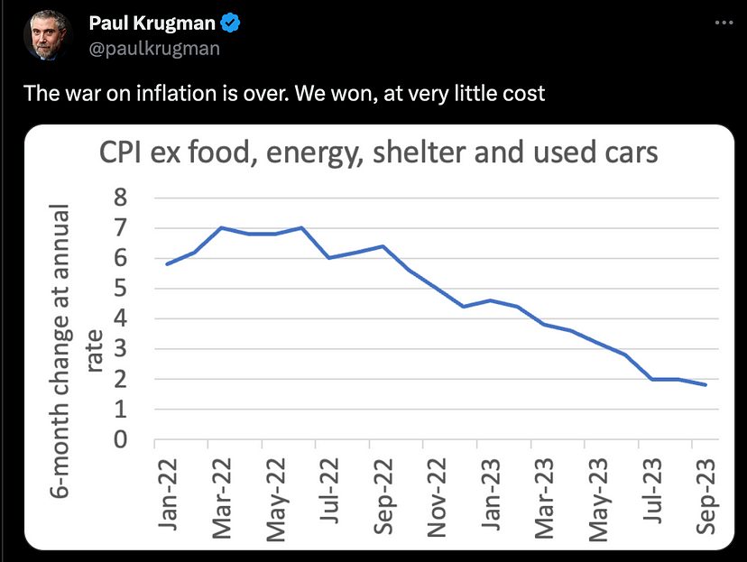 有鉴于此,很难想象私营部门能够收缩到足以抵消政府贡献的 GDP 增长净收益的程度。在最新的 2023 年第三季度数据转储中,美国名义 GDP 增长 6.3%,年度赤字接近 8%。如果 CPI 通胀率低于 6.3%,那么所有人都是赢家,因为实际 GDP 增长是正的。为什么选民会对这种情况感到不安呢?鉴于 CPI 通胀率处于 3 水平,在选民心目中,通胀要达到超过美国经济的水平,还需要许多个季度。