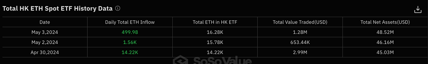 香港交易所官方数据:截至5月3日收市,华夏、嘉实、博时HashKey三家香港现货虚拟资产ETF上市首周资管规模达到了21.3069亿港元(约2.55亿美元),是虚拟资产期货ETF约11.92亿港元资产管理规模的近两倍,其中: