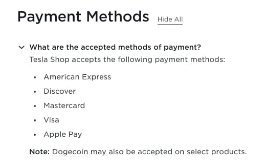 据Wayback Machine回溯,该特斯拉官网“付款、结账和定价”页面最近一次快照发生在今年2月28日,而Dogecoin常见问题解答页面在2022年1月便已经存在。