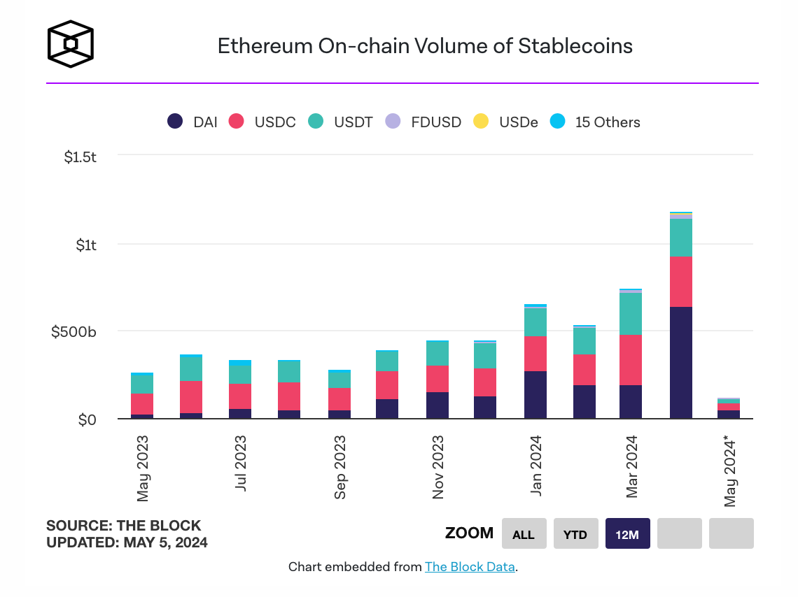 根据The Block的数据,DAI在四月份的交易量高达6360亿美元,占以太坊稳定币总链上交易量的主要部分,当月总交易量接近1.2万亿美元。与三月份相比,DAI在四月份的交易量增长了三倍多。