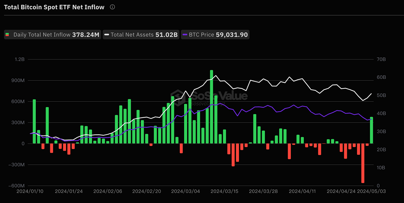 SoSoValue 数据:美国东部时间 5月3日,BTC现货ETF总净流入 3.78 亿美元,为过去7日净流出后首次净流入,其中,富达(Fidelity) FBTC,单日净流入最高,为 1.03 亿美元,目前 FBTC历史总净流入达 80.30 亿美元。