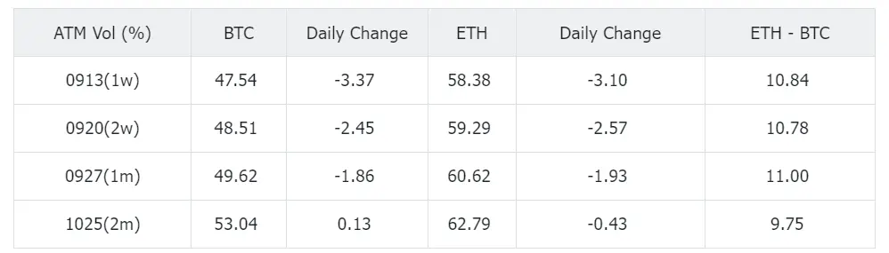 从局部的价格变化来看,BTC 前天一度下跌至一周内最低点后在 57000 美元附近得到支撑,日内反弹回到 59000 左右,隐含波动率变化与价格呈现负相关性,今日价格反弹后期限结构走陡,前端回吐了 2-3% vol 的涨幅,处在略低于过去三个月中位数的位置,基本和 Hourly 的 RV 持平,VPR 上没有太多的机会。