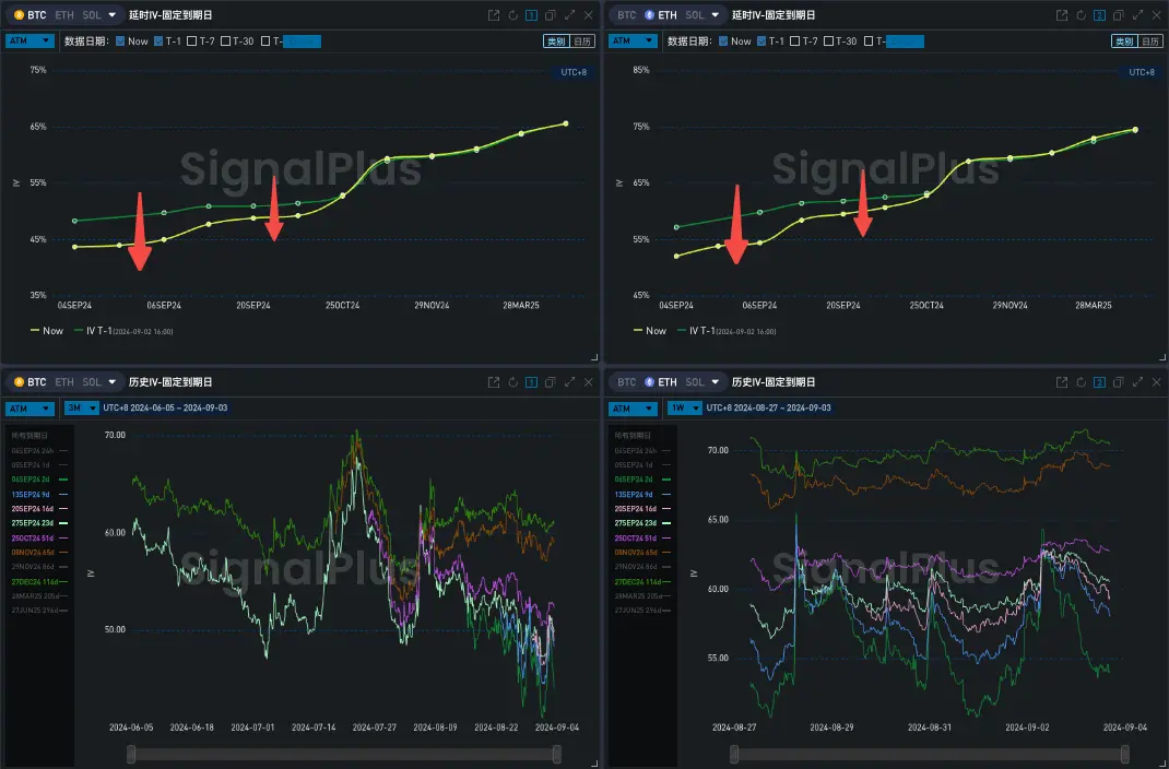 从 Vol Skew 的角度看,远端在长期看涨的情绪下维持高位,中前端 Risky 和价格的正相关趋势显著,但昨天值得注意的是 BTC 和 ETH 的涨幅差别比较大,从宏观层面上看,BTC ETF 海量的资金流出,Coinbase 溢价指数转负暗示的抛压以及矿工面临的利润下降困境为市场的情绪蒙上了阴影,从 Flow 上看,ETH 短期的看涨需求帮助推高了 Risky 的溢价,BTC 上尽管仍有远端看涨买入,但此轮价格上行引起的前端 Top Side Wing 上的卖出则无疑是抑制了其 Skew 的上涨。
