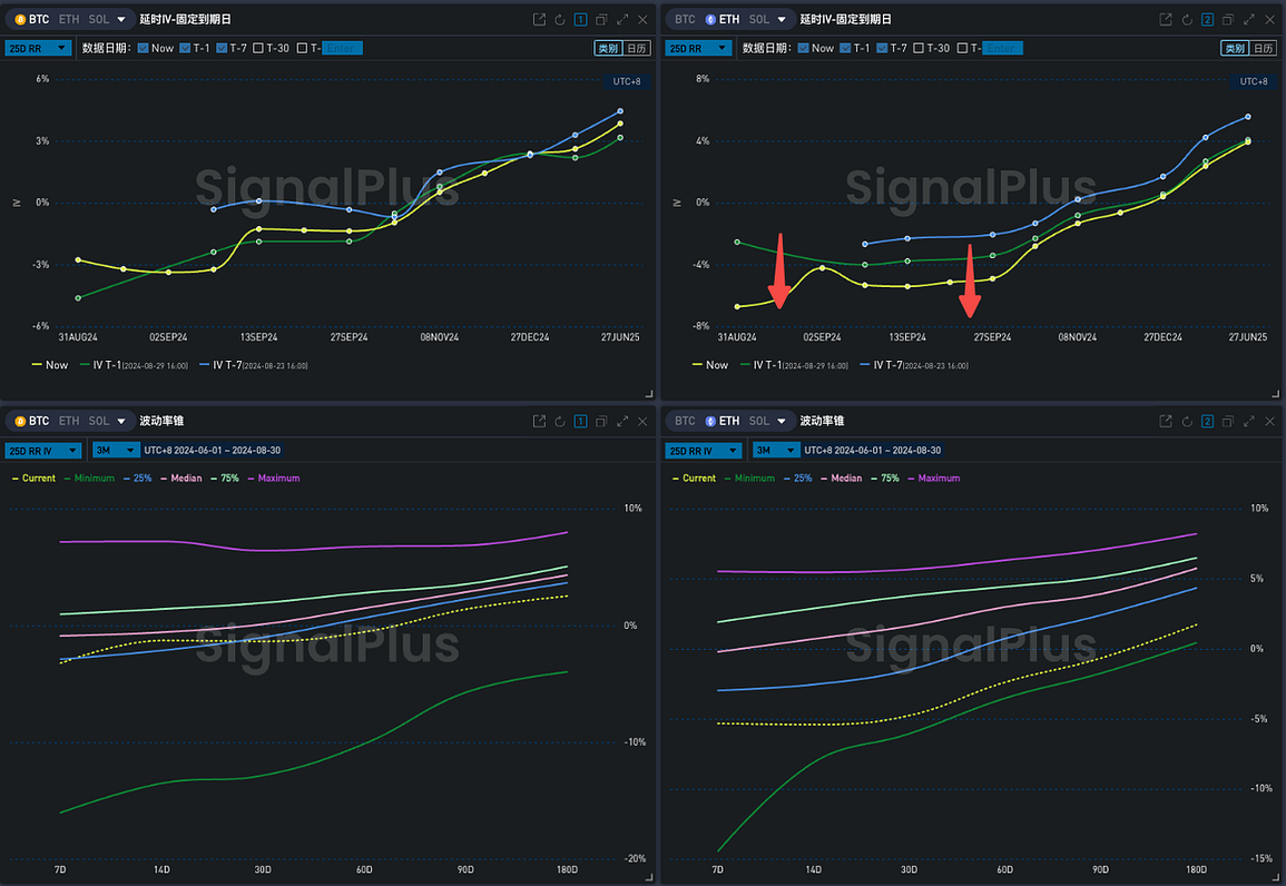 另一方面,ETH 前端的 Vol Skew 再度回到低位。永续合约资金费率的下降和 ETF 流入变化导致以太坊持续面临看跌趋势,尽管近期币价试图从 2400 反弹,但却始终未能突破 2600 这道强劲阻力。