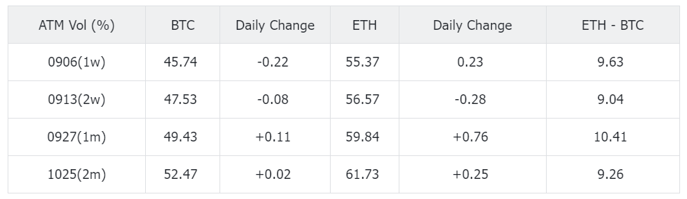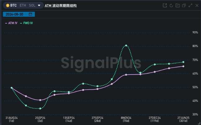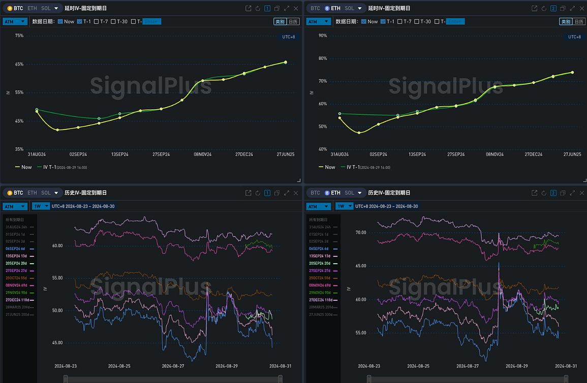 BTC 上较为明显的 Flow 还有 6 SEP 的 Long Put Spread,以及 13 SEP/20 SEP 66000 上的日历价差。在 Forward IV 的期限结构上也看到了他们的影响。对部分交易员来说,自 8 月全球央行会议鲍威尔的发言过后, 9.6 日晚间公布的非农就业数据显得异常关键,尽管那时 6 SEP 的期权已经到期,交易所也暂时没有更临近的到期日,该日期或许也能覆盖到前一日小非农(ADP 就业人数)数据能够解释的不确定性。