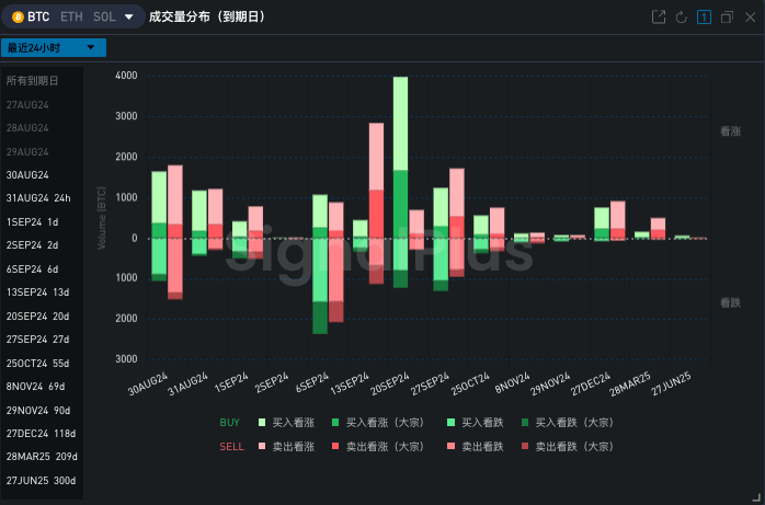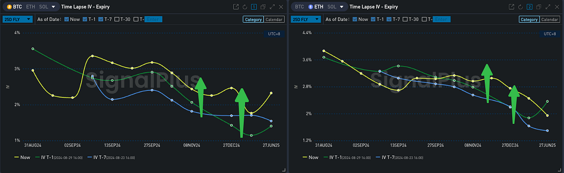 尽管整体 IV 变化并不显著,但曲面形状上仍有值得注意的变化。首先是 Fly,BTC/ETH 年底俩月的微笑曲率显著上涨,交易上我们看到以 BTC 27 DEC 80000 vs 100000 为代表的看涨价差策略,单腿成交量超过 200 BTC。