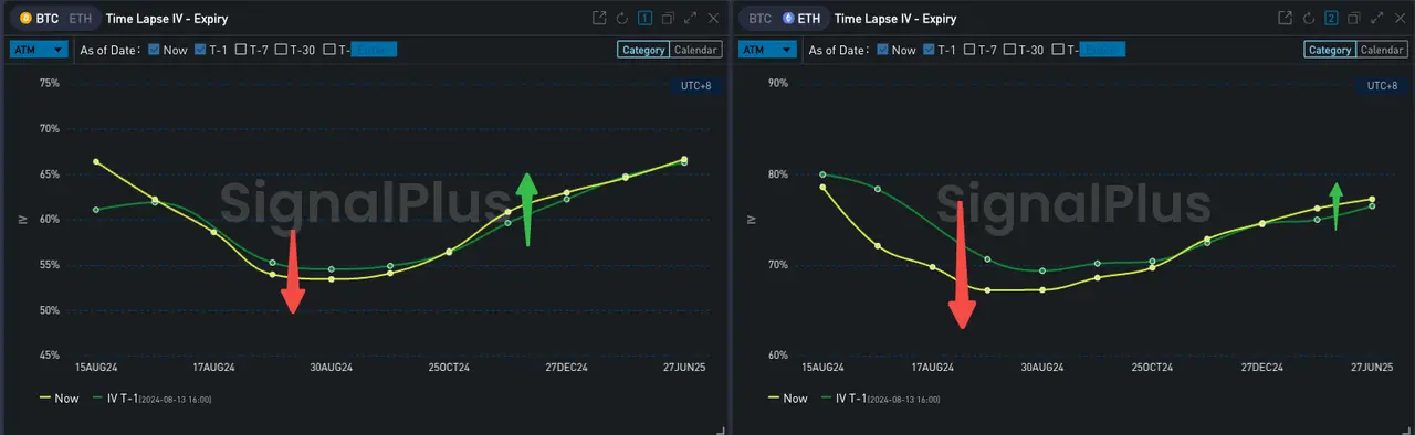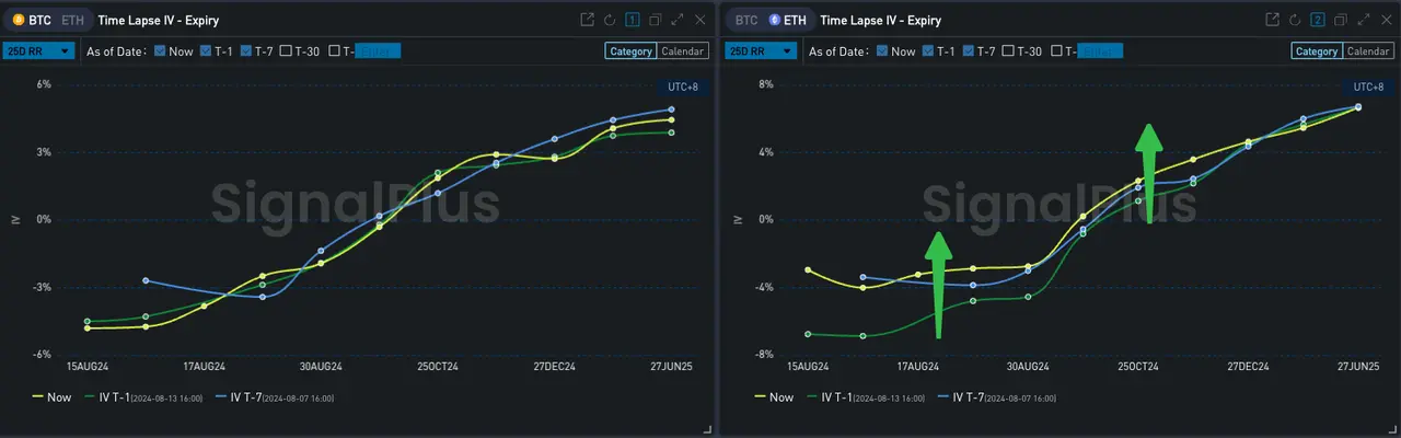 随着币价的上行,波动率曲面再度出现走陡的变化,具体来说,PPI 数据的公布打消了一些不确定性,中前端(尤其是 ETH)的 IV 明显下跌,但末日的 IV 仍因今晚的 CPI 数据而享有有较高的 Vol Premium,远端 IV 微微上涨,从交易上能持续看到一些 Top Side 的买入。从 Vol Skew 上看,ETH 的 RR 整体持续上涨,前日(12 Aug)Grayscale 的 ETHE 首次终结了资金流出,成为一个重要的转折点,整体 ETF 也连续两天得到正向流入,为 ETH 的币价提供了支撑和信心,使其连续突破 2600 和 2700 两道防线,再度向 3000 发起挑战。