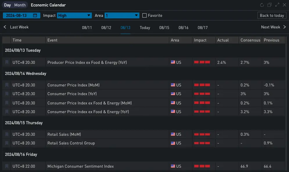 昨日(1 3A ug)美国 7 月 PPI 同比上升 2.2% ,低于预期,和前值比较也大幅下滑,在今天 CPI 发布之前,交易员增加了对美联储放宽政策的押注,十年期国债收益率现报 3.838% ,创近期新低,两年期跌破 4% ,报 3.941% 。美股受此提振集体收涨(道指+ 1.04% ,标普+ 1.68% ,纳斯达克+ 2.43% ),助力 BTC 冲破 6 w(收于 60874 $,+ 2.75% ),ETH 站上 2700 美元(收 2725 $, 2.75% )。