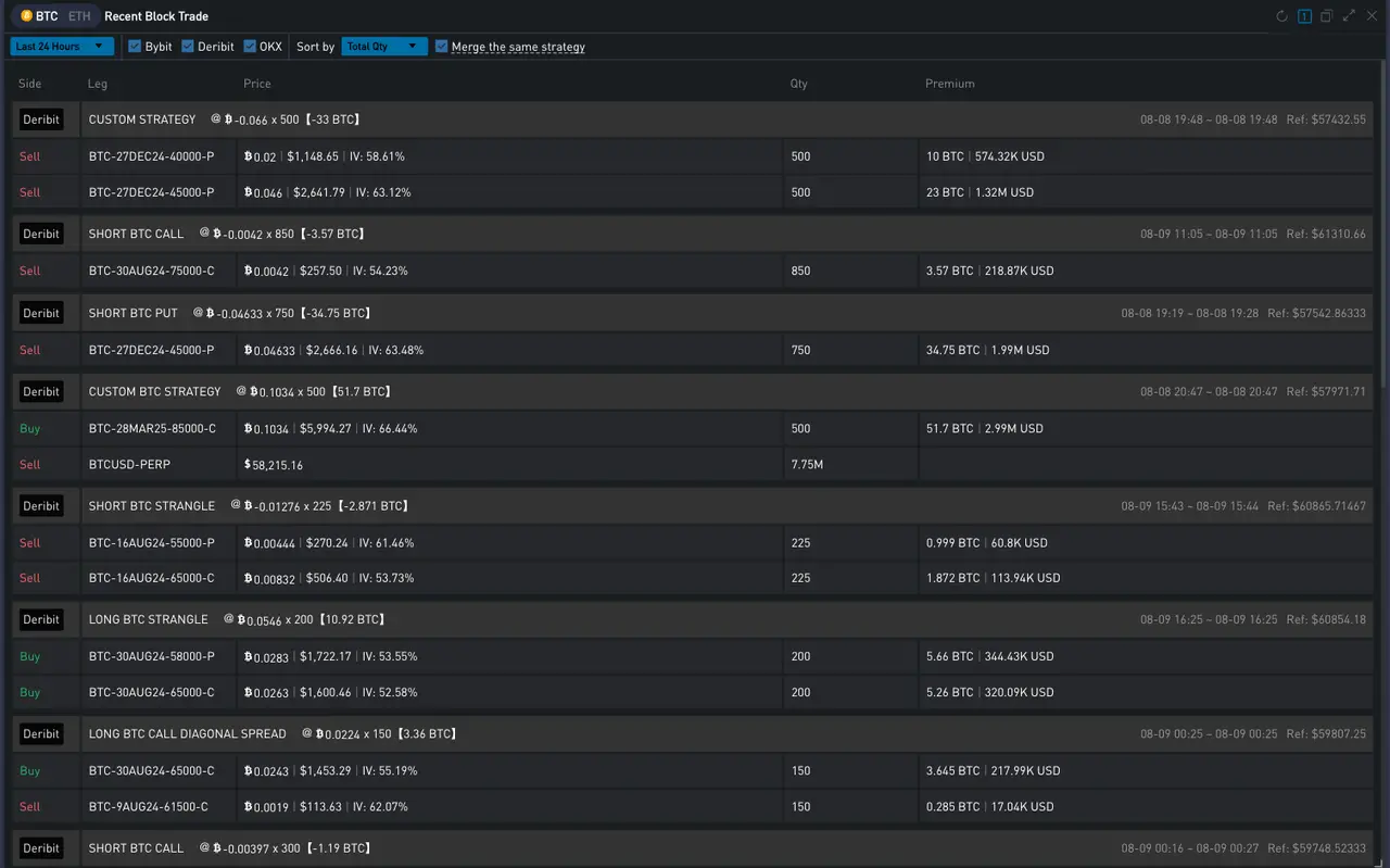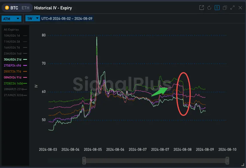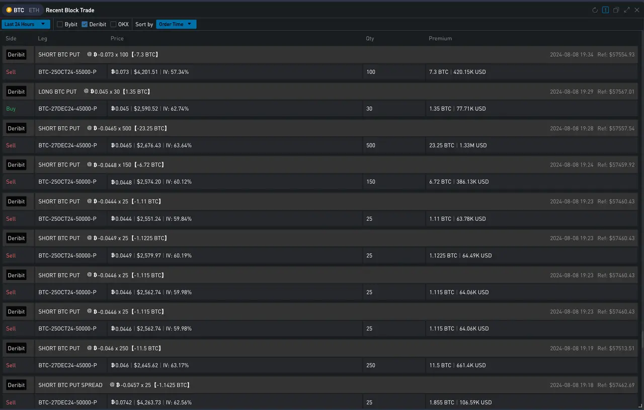 事情开始于 8 月 8 日晚上 7: 30 左右。在此之前,昨日 BTC 的画门行情将市场整体隐含波动率逐步推至高点,而正当价格恢复平静在 57500 附近小幅整盘时,Deribit 市场上突然出现大量 Dec 和 Oct 的卖出看跌期权成交,年底的 IV 短时间内被砸低 3% Vol,带动整条 Vol Curve 大幅向下平移。