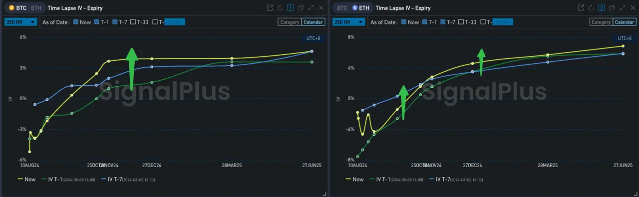 另外,经过这两轮事件后我们观察到,币价的上涨带动 Vol Skew 回升,自看跌一侧的大量抛售更是显著增加了 BTC 十月到年底斜率,使得 25 dRR 指标在局部范围内大幅上行,波动率曲面在一夜之间发生了明显的转变。