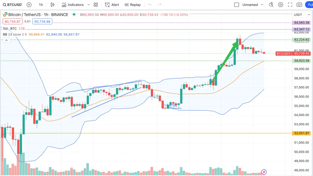 而后来到晚上 08: 30 ,美国公布了新一轮的初请失业金人数,数据下降幅度接近一年来最大,缓解了人们对全球最大经济体经济放缓的担忧,美股强劲反弹(道指/标普/纳指分别收涨 1.76% /2.3% /2.87% ),美债收益率走高。作为与美指高度正相关的风险资产,BTC 价格也受到提振,从 57500 一路上行突破 60000 美元,并一度挑战 62000 这道关键支撑位。