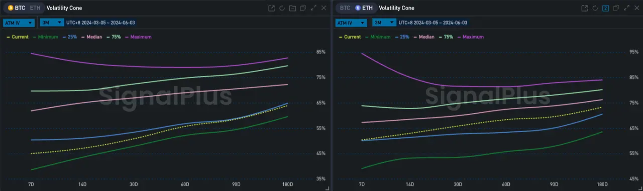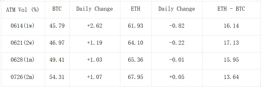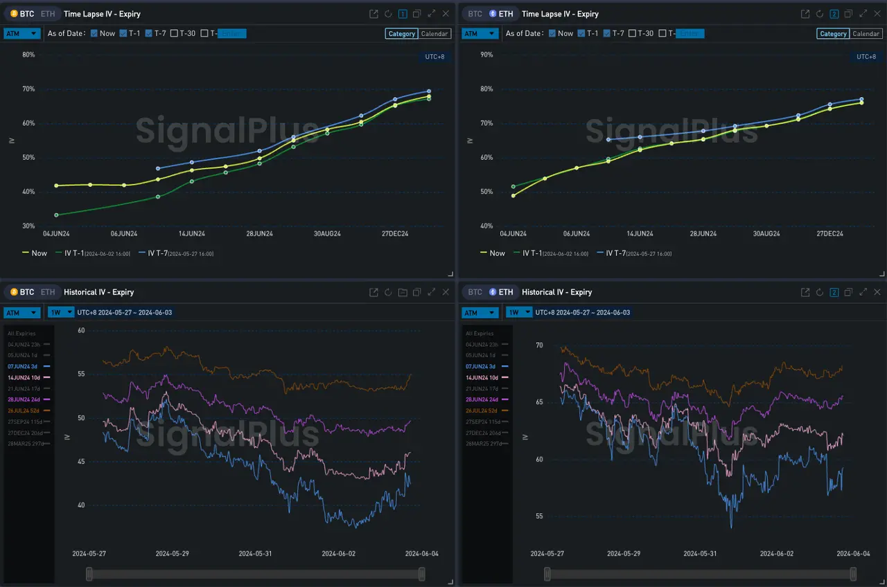 期权方面,BTC 前端 IV 在进入工作日之前小幅反弹,但整体仍处在历史三个月的 25% 分位数以下的相对低点;ETH 略低于历史中位数,期限相对曲线偏陡,观察过去 24 小时的成交也可以看到,六月中上旬看涨期权的卖压强劲,相反六七月底及其以后的 Call 大受欢迎,或许也和 ETF S-1 的批准预期有关,当前市场“共识”仍是“最快七月批准”,届时资金进场,币价有望再度上行突破,但从另一方面说,当前 Grayscale 的 Ehereum Trust(ETHE)管理资金规模高达$ 11 B,所以也有人担心 ETF 批准发售以后市场会重演当时 GBTC 的抛压。