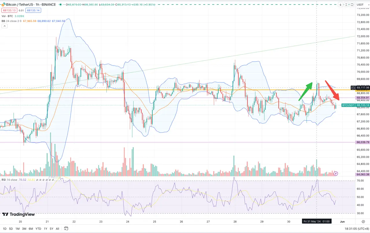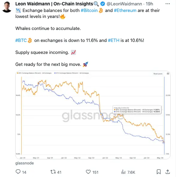 数字货币方面,根据 Leon Waldmann 在推特展示的 Glassnode 数据来看,自 ETH ETF 批准后,BTC & ETH 在中心化交易所的存量占比已经降至历史新低,价值大约$ 3 B 的以太坊离开了中心化交易所,增加了潜在空头挤兑的可能性。BTC 今日上行突破了 68500 美元阻力位,开始向下一道阻力位 71500 发起挑战,截止目前,BTC 已在 68500 附近盘旋了接近 12 天,如果突破无望,有可能再次回到 66000 寻求支撑。