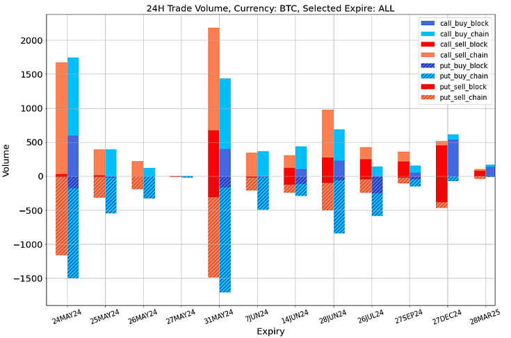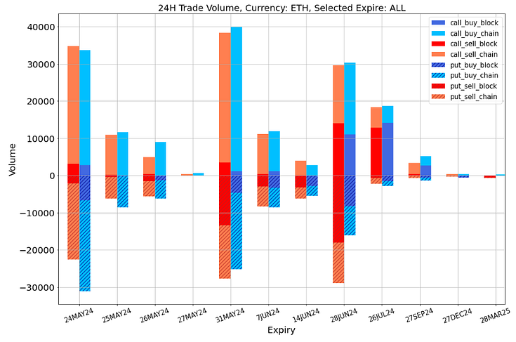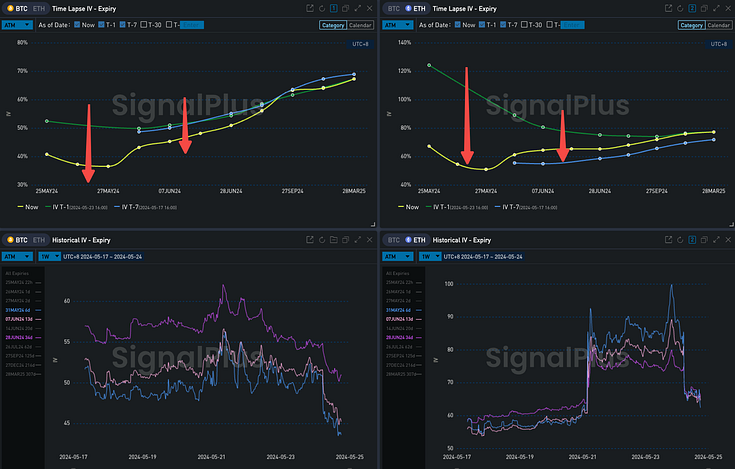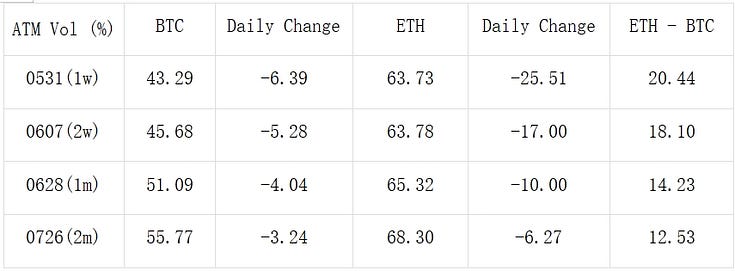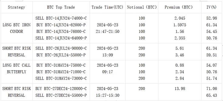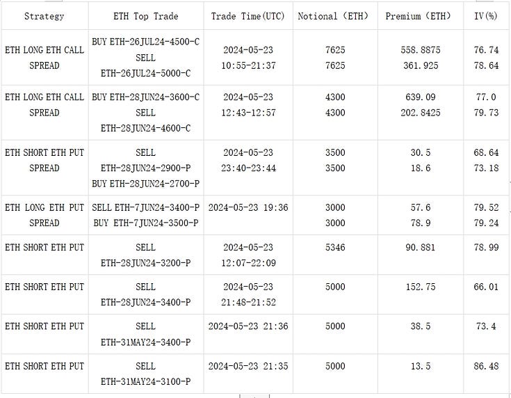 期权方面,ETF 的靴子落地后 BTC 和 ETH 的整体 IV 水平也很快回落,曲线走陡,ETH 平均 IV 水平回到 63% 左右。交易方面,ETH 的大宗 Top Trade 展示出明显的方向性,我们观察到五六月底 20000 张 ETH 的 short put,还有六七月底两组合计约 12000 张 ETH 的 long call spread 成交,正如上文所说, 19 b-4 获批只是打赢了胜利的前哨战,ETH 现货 ETF 的 S-1 申请通过还需要几周甚至几个月的时间,等 TradFi 的资金真正流入了数字货币市场,币价上行才有更实在的动力。