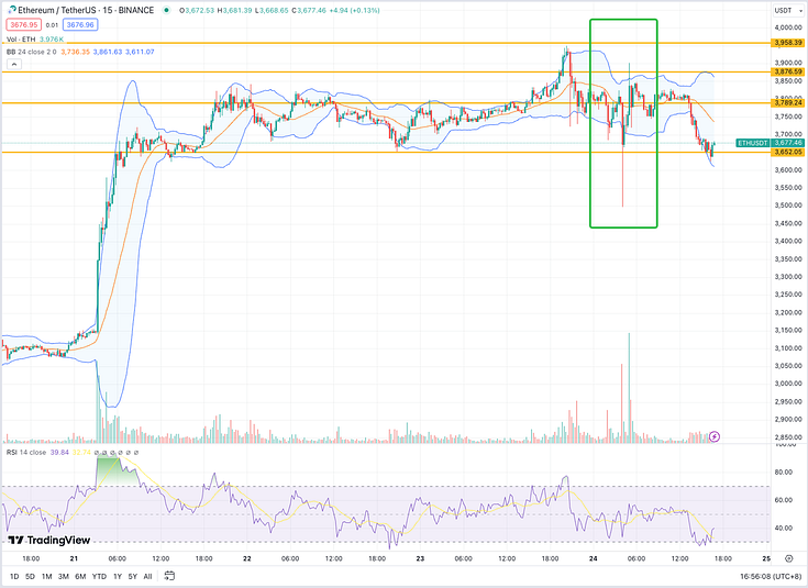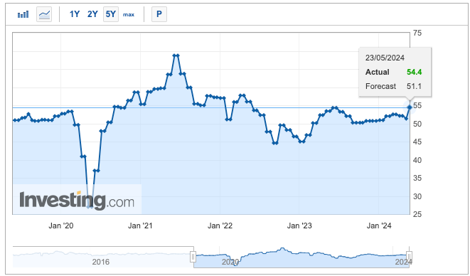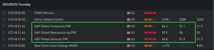 昨晚(23 MAY)的行情没有辜负市场的期待,从晚上九点一直热闹到凌晨。在万众瞩目的 ETH 现货 ETF 公布之前,以太的币价一路上行挑战 4000 点高位,但很快便在最高处短线回吐过去一日的全部涨幅,下探至 3720 美元附近。尽管价格很快收复了大半失地,但 21: 45 (UTC+ 8)美国公布的最新数据又给到风险市场一记重击。数据显示,美国 5 月标普全球综合 PMI 指数录得 54.4 ,大超预期的 51.1 并创下过去两年以来的新高,制造业和服务业 PMI 也同样超出预期。数据公布后,美债收益率短线大涨,十年期收益率一度达到 4.4980% ,两年期也重新站上 4.9% 之上。交易员也将美联储首次降息时间推迟到 12 月,期货市场削减全年降息押注至 34 个基点,三大指数全线收跌,英伟达逆势收涨 9.3% 创下历史新高独领风骚。