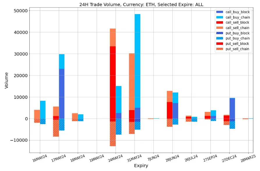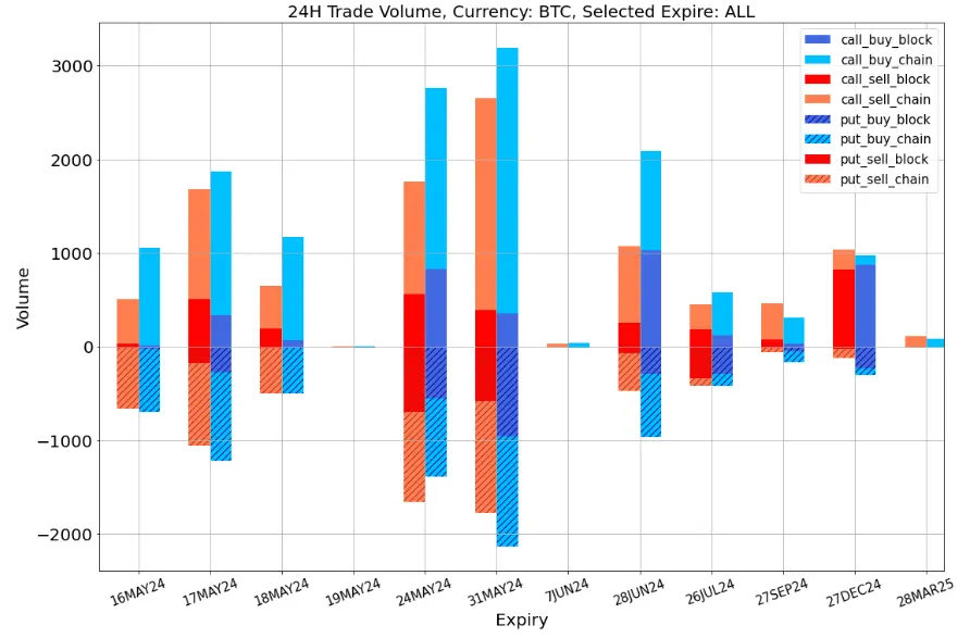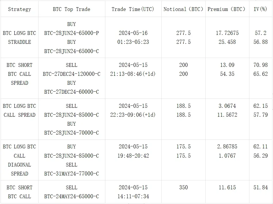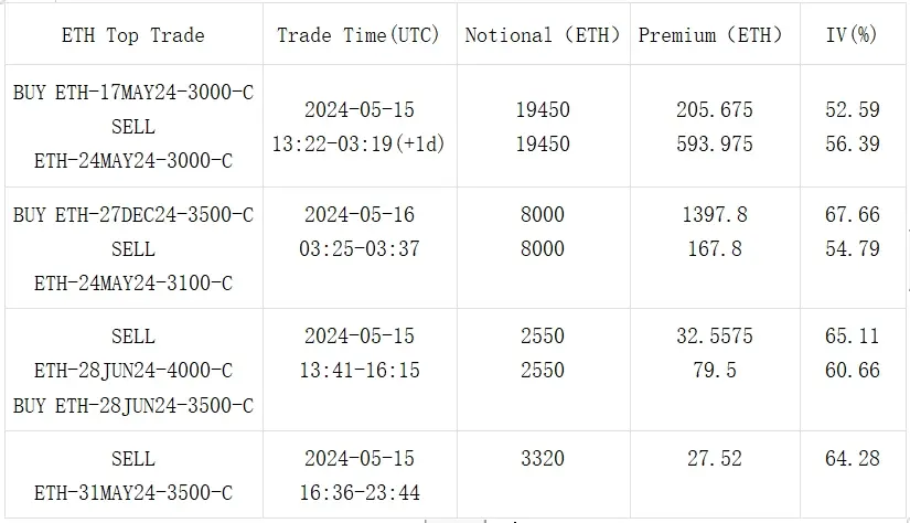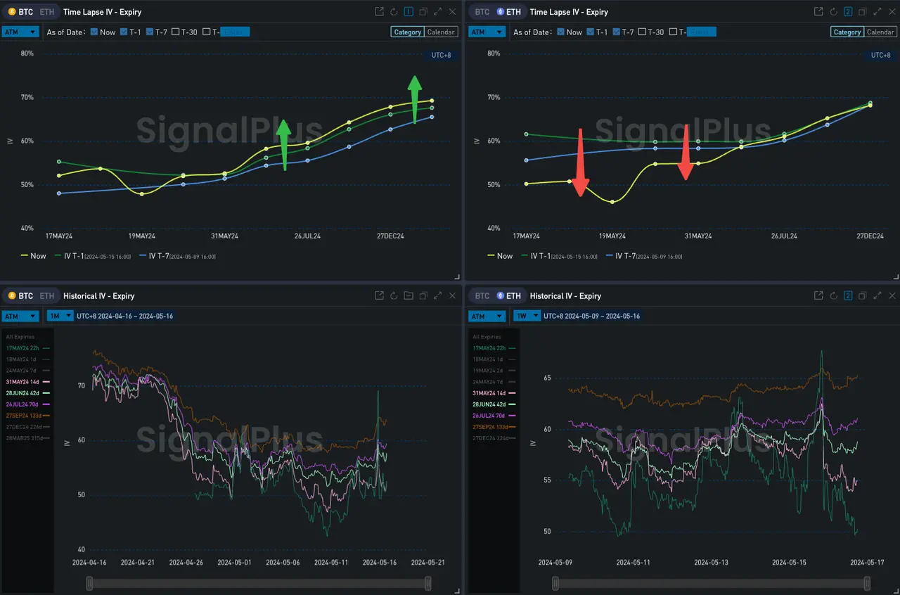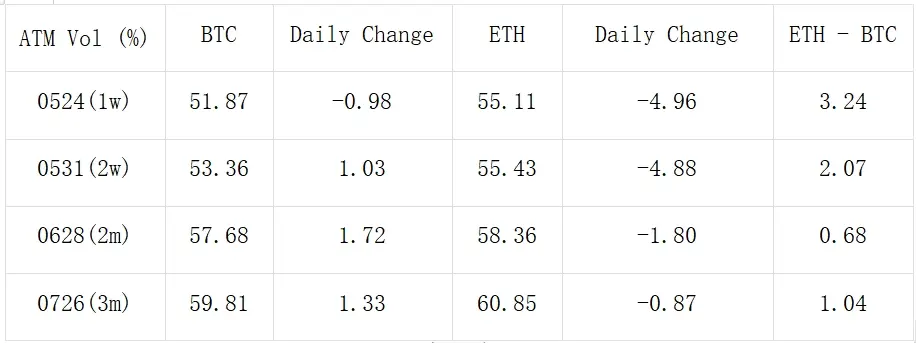 期权方面,BTC 和 ETH 的隐含波动率水平也呈现出截然不同的变化。BTC 的主要变化体现在中远端 IV 的上行,过去一日的大宗交易也主要分布在中远期,最大的一笔是 277.5 BTC per leg 看涨六月底波动率的 Long Straddle,还有卖 5 月买 6 月 Call 的对角价差。ETH 前端 IV 大幅走低,吸引到了大宗上一组数量高达 19450 ETH per leg 的 Buy 17 MAY vs Sell 24 MAY 成交,同时五月底期权链上也有不少看涨期权建仓,尽管 ETH 最近表现相对不佳,但仍有交易员在为其接下来的上行空间买单下注。