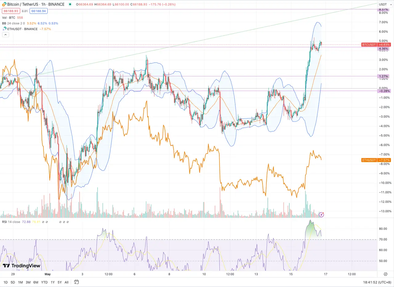 数字货币方面,受美国经济数据走软的提振,BTC 价格一路走高突破 66000 关口,引来社区的狂欢,BTC Spot ETF 近期的流入也比较健康,尽管 IBIT 不再有增长,但昨天单日总流入也达到了 303 $m,主要由 FBTC 和 BITB 贡献。另一方面,从下面的对比图中能看到,在这轮行情中 ETH 的表现相对较差,过去 24 小时也仅获得 BTC 一半的涨幅,重新回到 3000 美元附近震荡。