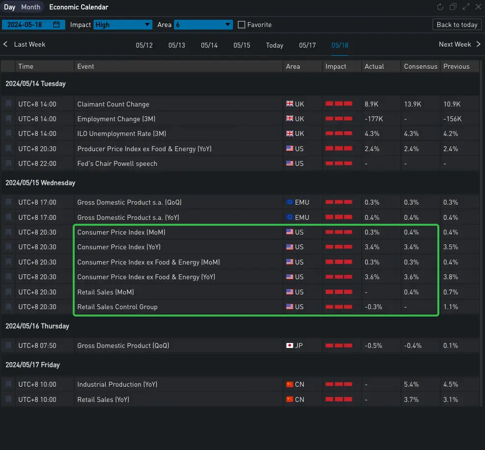昨日(15 MAY 24)迎来重磅经济数据公布,在过去几天连续三份通胀数据超出预期的情况下,美国 CPI 指数大致符合预期;零售数据则是意外持平,延续了近期消费者数据疲软的现象。尽管当前通胀水平和动能仍远高于美联储的目标,但这两份数据在一定程度上缓解了市场对价格重新加速的担忧,恢复了市场对美联储九月降息的信心,美债收益率短线下行,美国三大股指也纷纷收涨 1% 左右,创下历史新高。