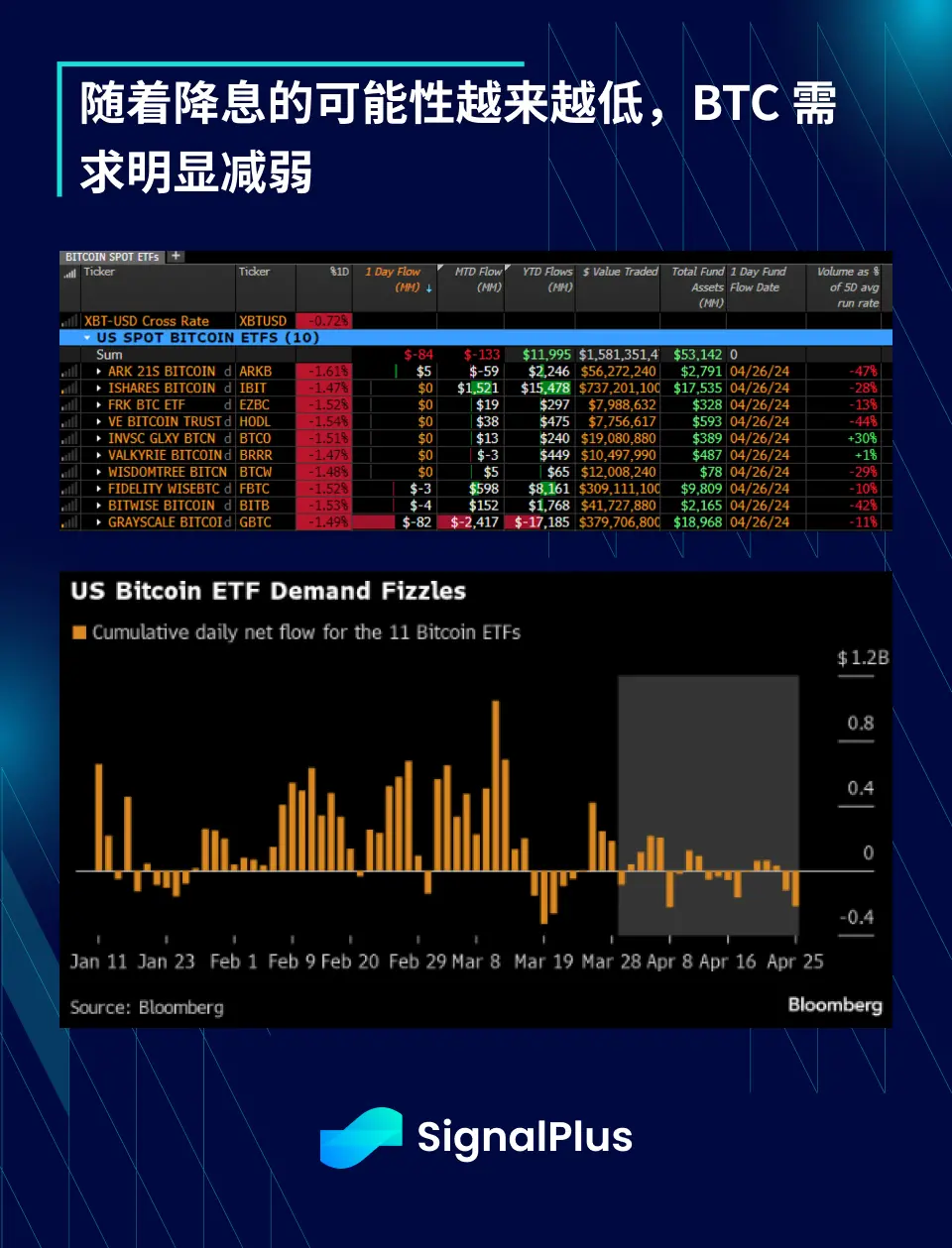 在加密货币方面,主要 ETF 产品均没有出现显著的购买兴趣,继上周四流出 2.18 亿美元资金后,周五又流出了 8, 400 万美元。此外,尽管仍远高于 2023 年的水平,但 CME 的 BTC 期货未平仓量已自近期历史高点大幅回落,主流 FOMO 情绪明显放缓,特别是在降息可能性越来越小的情况下。原生用户的兴趣仍集中在 BTC 符文/ memecoins 以及 ETH 的 L2 再质押和其他收益增长领域,这些领域对一般投资者来说较为陌生。在 5 月稍晚时候的 FOMC 会议和 CPI 数据尘埃落定之前,我们对近期价格走势保持谨慎,并倾向采取观望态度 。