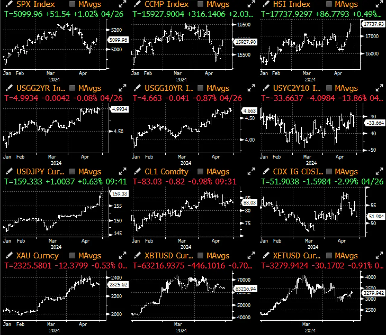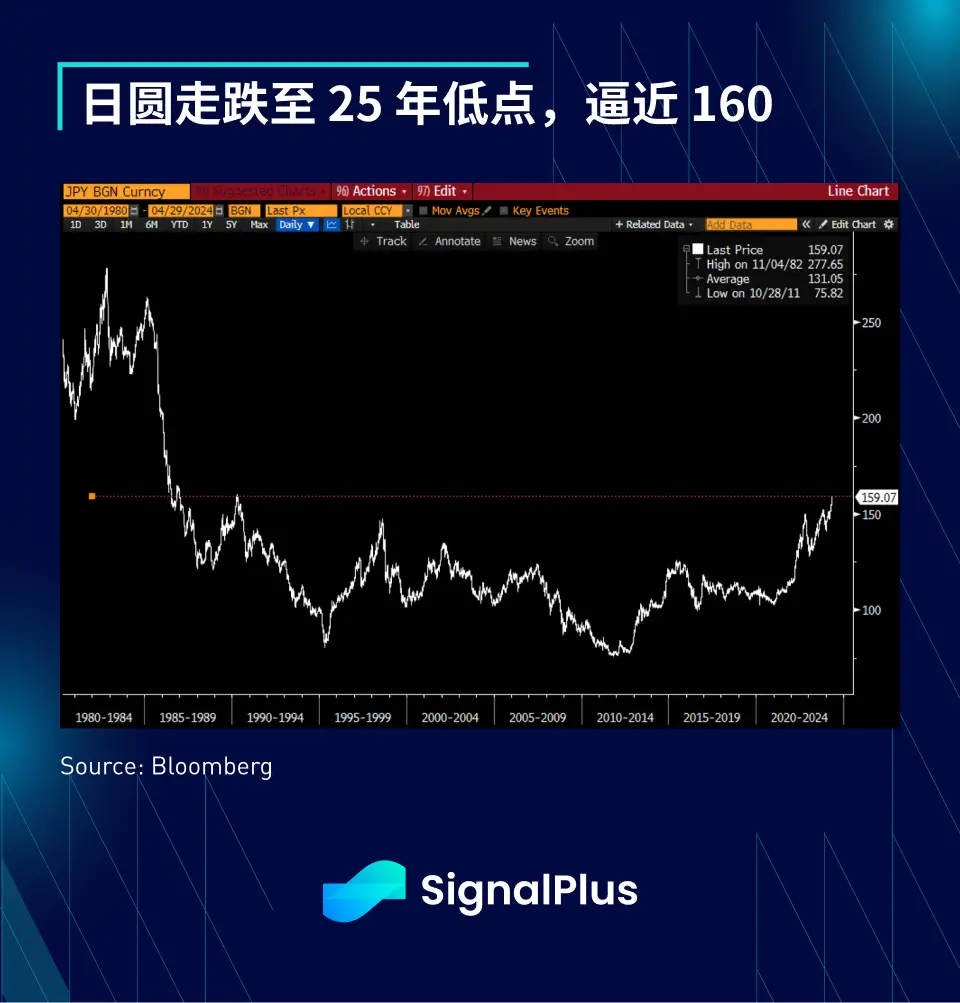 然而,由于美债头寸已接近极度看跌,且 PCE 结果并不比市场预期的更差,利率全线下滑约 3 个基点,Nasdaq 指数因收益率走势和强劲的科技股盈利而上涨了 2 %。另一方面,日圆引起更多关注,相对于鹰派的美联储,日本央行仍然选择保持鸽派立场,日圆汇率目前高于 159 ,逼近 25 年高点 160 左右。