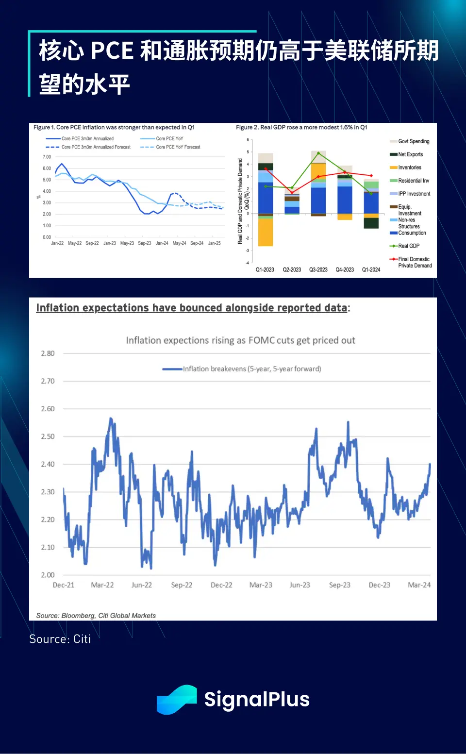上周五美债收益率稍微得以喘息,核心 PCE 数据基本符合分析师的偏高预期(整体和核心环比增长 0.3% ,同比增长 2.7% /2.8% ),同时核心服务环比增长 0.39% ,高于 2 月份的 0.19% ,实际个人消费支出也意外上升,经济和价格压力比预期更为顽固,给本周稍后的 FOMC 会议带来了进一步的鹰派压力。密大消费者信心指数则基本维持在 77.2 ,然而 1 年期通胀预期从 3 月的 2.9% 重新上升至 3.2% , 5-10 年期通胀预期也从 2.8% 升至 3.0% 。