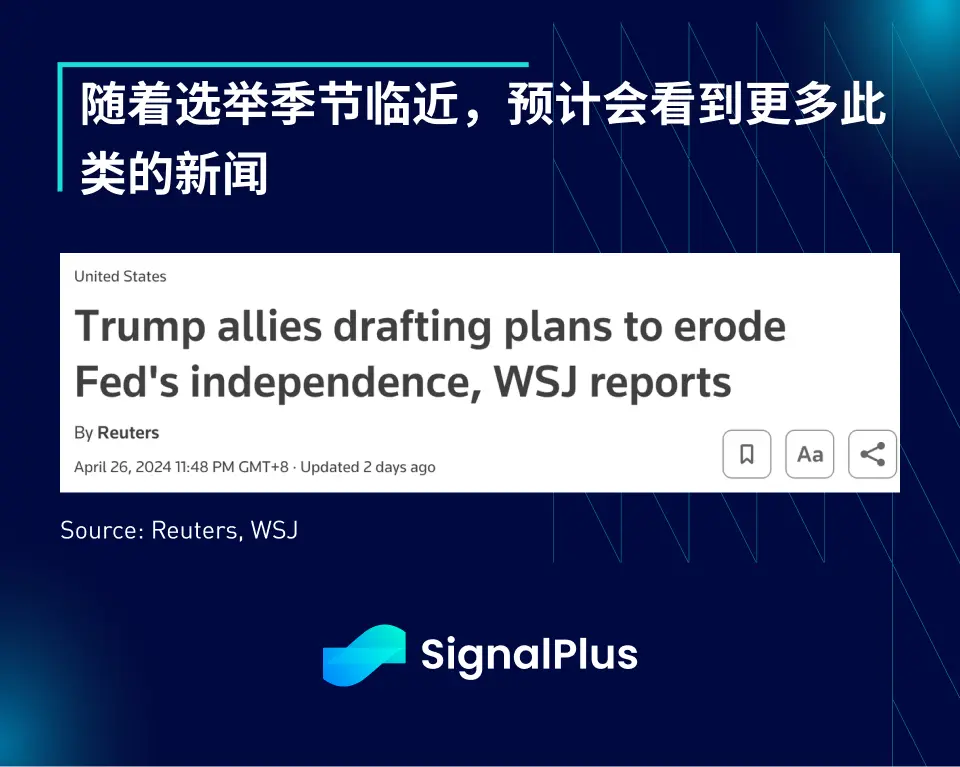 FOMC 会议将是本周关注重点,但在会议前后市场还会受到美国 JOLTS 和非农就业数据的影响,而 CPI 和 Nvidia 财报预计将成为本月晚些时候最大的市场影响因素,届时这家芯片巨头将寻求扭转去年 10 月以来最差的月度表现。此外,WSJ 报导称,前总统 Trump 的盟友正忙于制定一项秘密计划,使他再次当选后能够“消除”美联储的独立性,当然这种情况很难发生,但在某些非典型场景中(BTC 到 20 万?)也算是一个有趣的想法。