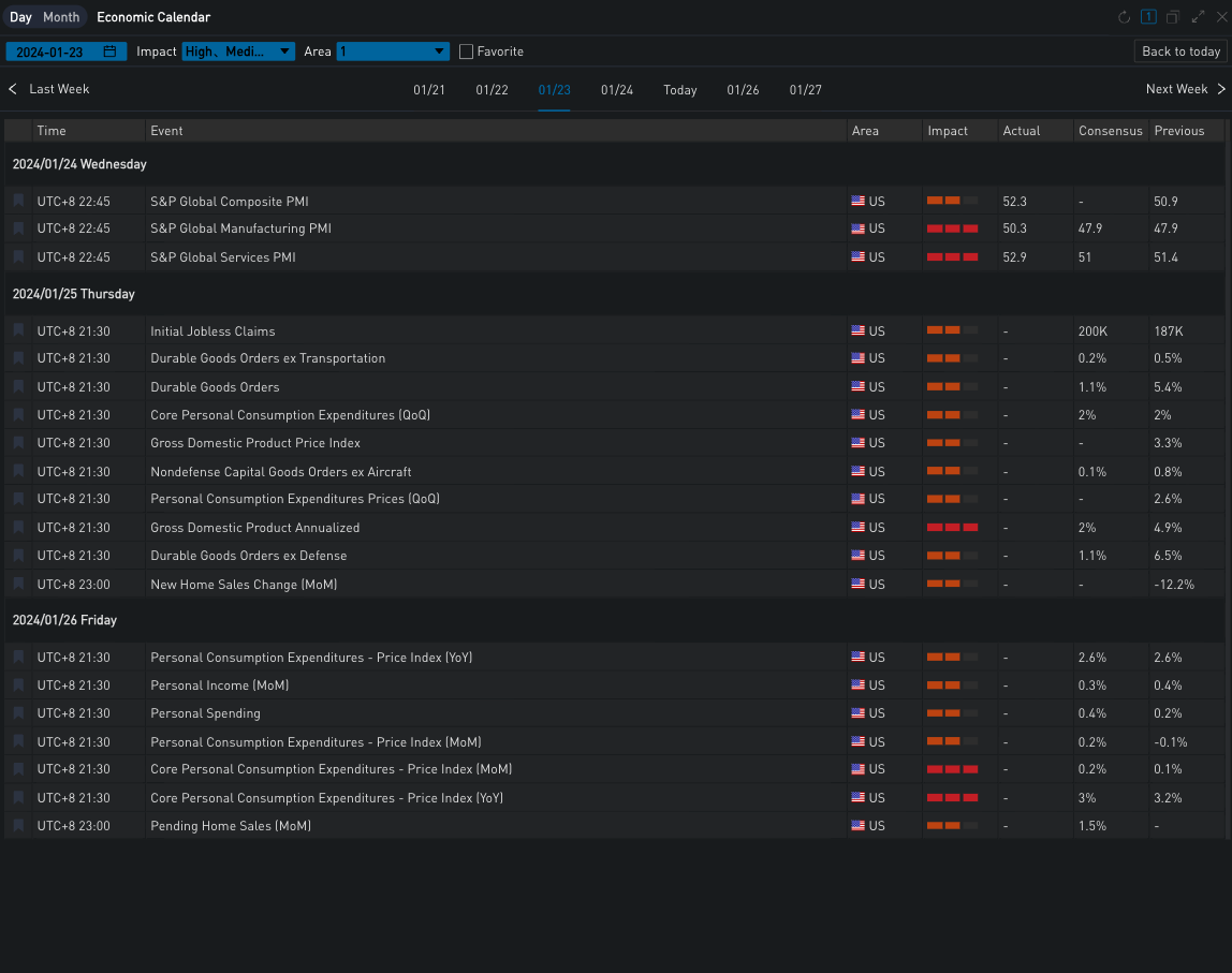 昨日(24 JAN)美国 1 月制造业和服务业 PMI 初值均高于预期,分别录得 50.3 和 52.9 ,同时综合 PMI 初值录得 52.3 ,为 7 个月新高,此外五年期美债拍卖结果也不甚理想,市场风险情绪得到改善,美债收益率缓慢上升,当前两年期/十年期分别为 4.376% /4.158% 。美股方面,能源和大型科技股再次领涨,标普和纳指小幅上涨 0.08% /0.36% ,道指则收跌 0.26% 。