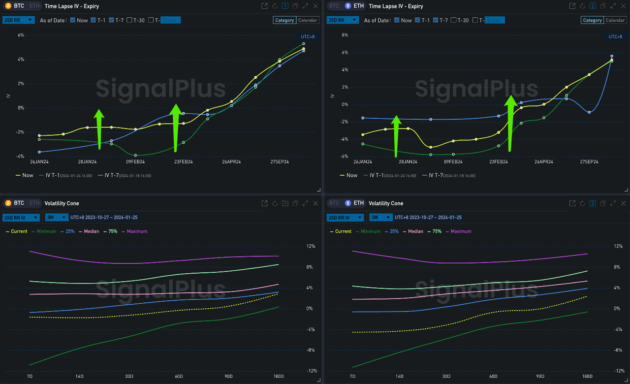数字货币方面,自 ETF 批准至今,GBTC 的总流出几乎单方面抵消了其他九只 ETF 的总流入,市场仍在面对短期资金外流和缺乏正面激励的困境,过去 24 小时 BTC 和 ETH 分别围绕 40000/2220 美元上下窄幅震荡,前端隐含波动率走陡,下跌大约 3% 左右,另外价格稳定后 Vol Skew 也有大约 2-3% 左右的回升,但仍处于近三个月以来的低点。