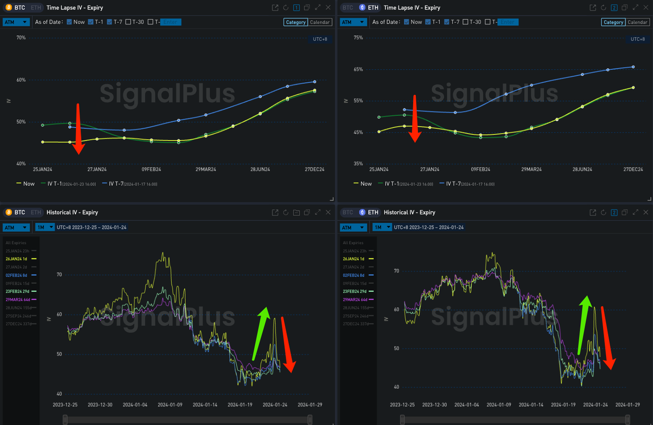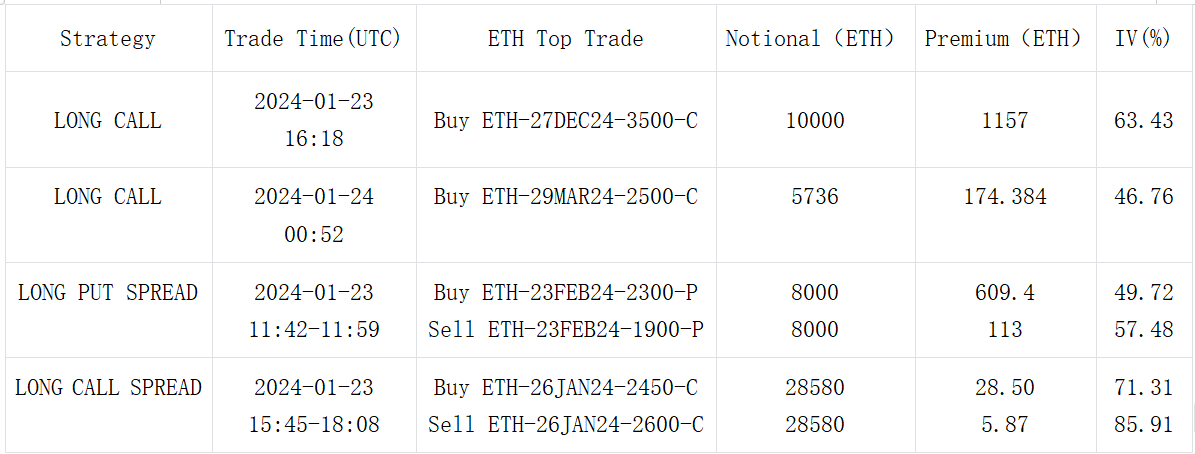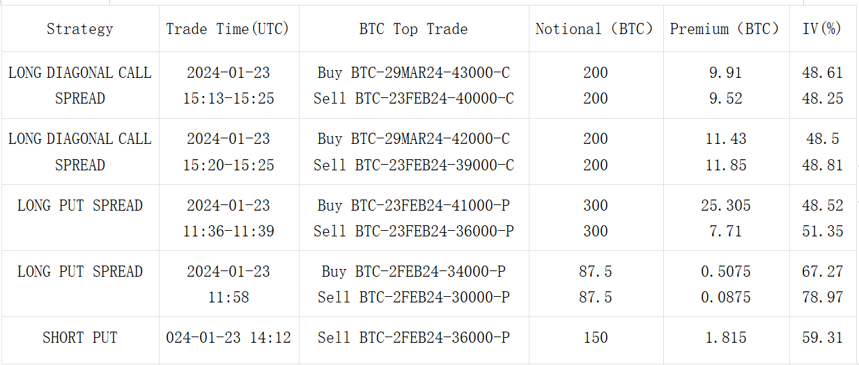 数字货币方面,昨日 BTC 在承压下破 4 W 后引发了少许的恐慌情绪,一度短期隐含波动率曲面大幅走平上行,但随着价格反弹回到 4 W 附近,IV 也随之回吐之前的全部涨幅。交易方面,市场明显表露出了对二月底之前价格上行的悲观态度,譬如以 BTC Short 23 FEB-40000-C vs Long 29 Mar 24-43000-C 为代表的三角价差,还有诸如 BTC 23 FEB 41000-P vs 36000-P,ETH 23 FEB 2300-P vs 1900-P 的 Long Put Spread;但也有例外,短期看涨的 ETH 26 JAN 2450 vs 2600 Long Call Spread 上成交了约(单腿) 18000 ETH,成交时的 ETH 集中在 2200 附近,是昨日的局部低点,同时还有一笔罕见的远期大宗看涨 27 DEC 24-3500-C(Size: 10000 ETH)。