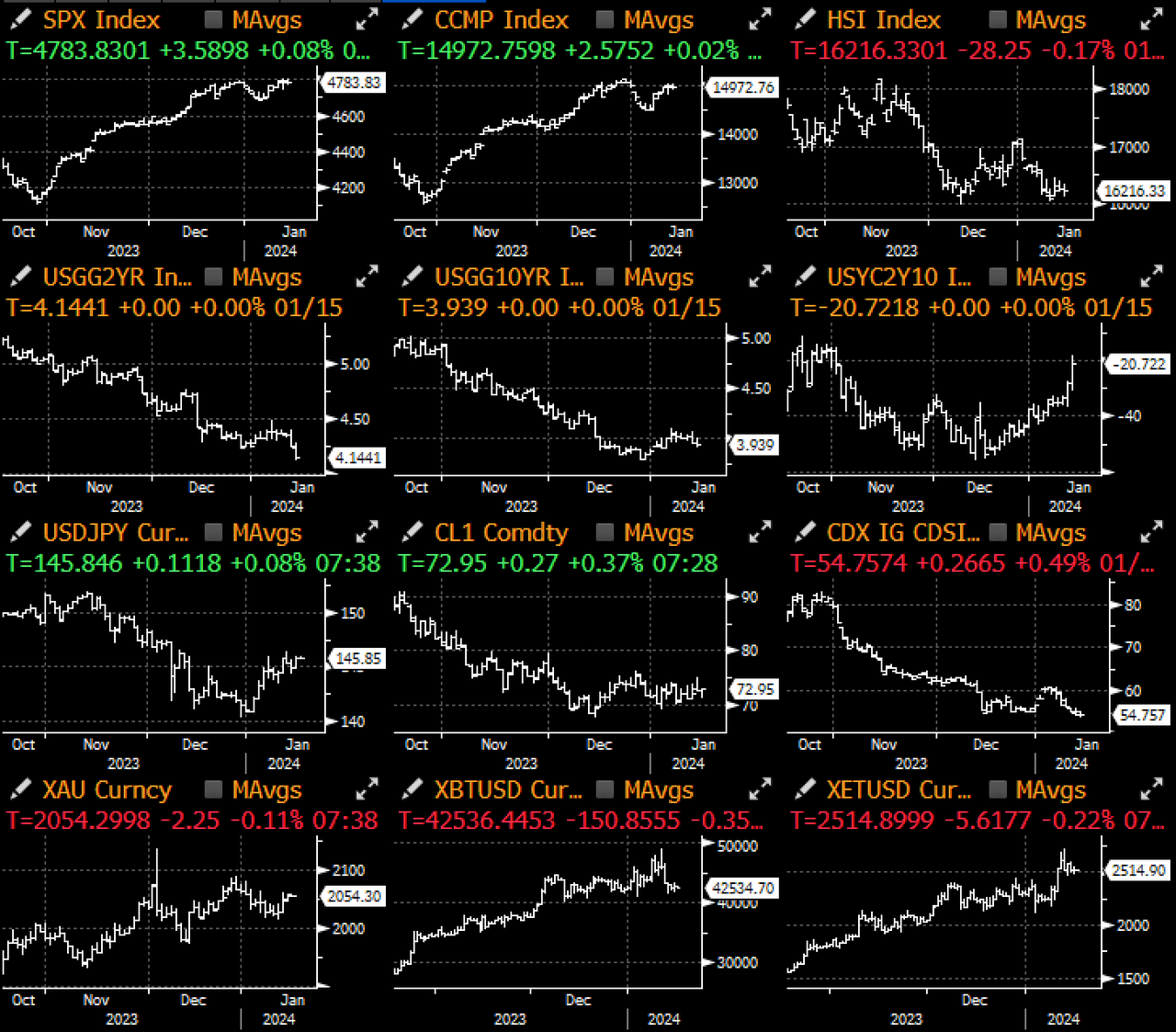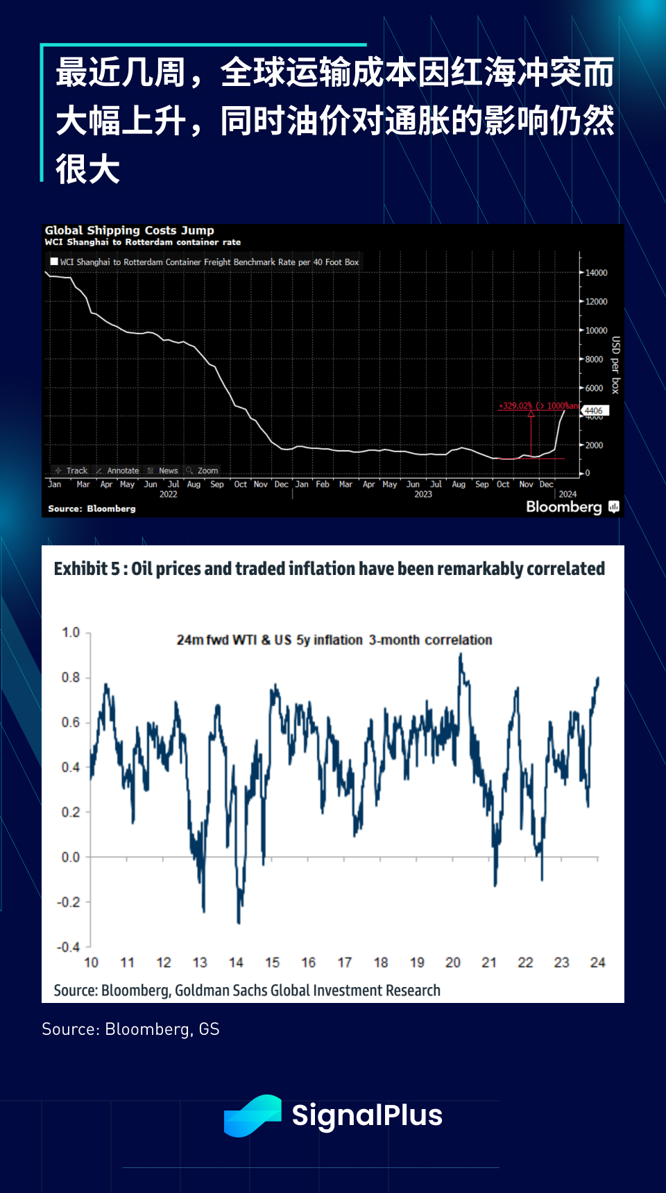 说到通货紧缩,根据高盛估计,自 2022 - 2023 年以来,全球核心通胀已大幅放缓,落至平均 2% ,市场并没有忽视这一点,对 2024 年降息幅度的定价不断加大,将央行逼入必须实施宽松政策的境地,然而,与此同时,全球航运成本因红海冲突而开始飙升,且原油与通胀的相关性保持在历史高点附近,此外,依然强劲的企业获利和零售销售可能会为通胀提供支撑,而市场目前对通胀复苏并没有充分准备,这是我们今年要牢记的一点。