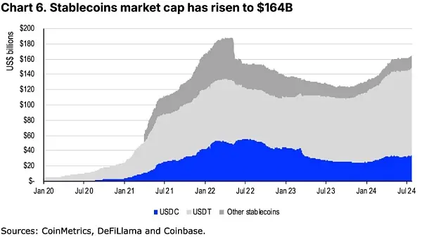 尽管稳定币相关的交易量巨大,但这一领域的市值仍相对适中,为1640亿美元,尽管自年初以来已增长了26%。(见图6。)尽管如此,稳定币目前只占2.3万亿美元加密市场市值的7%。一些市场分析师推测,稳定币市场在未来五年内可能增长到近3万亿美元。虽然这个数字看起来很高,因为这个估计接近当前整个加密市场的规模,但如果考虑到这一数字仅相当于美国M2货币供应量(21万亿美元)的14%(目前为0.8%),我们认为这仍然在可能范围内。