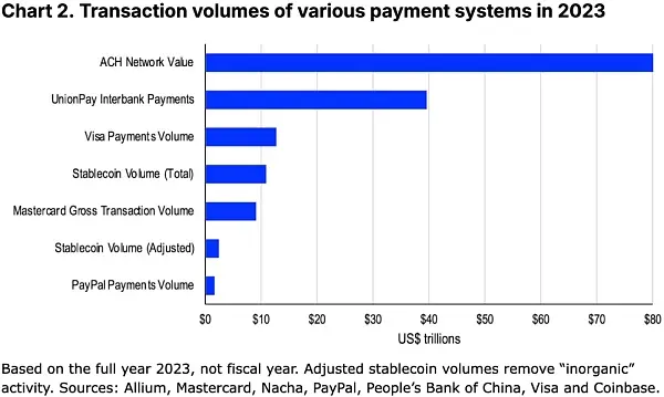 2023 年,稳定币结算了价值 10.8 万亿美元的交易,其中 2.3 万亿美元与支付、跨境汇款等有机活动有关