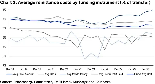 尽管现有支付网络在流动性和网络效应方面享有一些重要优势,但随着竞争的加剧,根据世界银行的数据,过去15年间,汇款支付的平均成本已降低了三分之一以上。然而,目前全球范围内汇款200美元的平均成本仍为汇款金额的6.35%,每年费用总计约540亿美元。相比之下,使用稳定币汇款的平均交易成本要低得多,仅为汇款金额的0.5%至3.0%,并且由于新技术的不断创新,成本还有进一步下降的潜力。