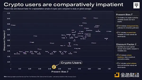 该研究显示,加密用户的现时偏差高于平均水平,贴现系数较低,这表明他们倾向于冲动行为,更喜欢或得即时满足,而不是未来收益。
