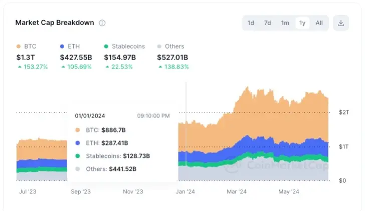 如果我们来换一个角度看数据,我们就可以发现一些很有意思的地方。根据 Coinmarketcap 数据,自从 24 年年初开始,加密货币总市值从 1.7 万亿美元一路波动上升到 2.4 万亿美元,这是一个很令人欣喜的数据。但是如果分开来看,比特币和 ETH 在这部分上升中占了绝对大头;