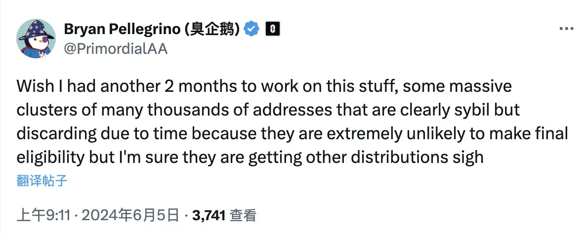 最大的问题则出自举报环节, LayerZero 积极发动社区的本意或许是想要减轻工作负担,以群策群力的方式来提升效率,但实际上 LayerZero 最终需要对超 3000 份报告进行逐一检验,以筛选出逻辑成立的有效报告,这反而成为了一项更加费时费力的工作,如果粗略筛查,很容易造成疏漏;如果精细筛查,需要大量的人力与时间成本 —— 事实上,就连 LayerZero 创始人 Bryan Pellegrino 本人也曾感叹,希望能够有更多的时间来处理这些事情。此外,由于举报环节出现了一定的恶意举报、名单剽窃、地址投毒等行为,人性中恶的一面被充分暴露,社区的不满情绪也被逐步推高。