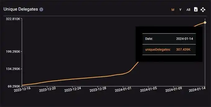 Smart Stake 数据显示,TIA 当前的全网质押率已达到 48% ,考虑到 TIA 创世才刚刚过去两个多月,这一数据已相当可观,甚至超过了许多老牌 PoS 网络(比如 35% 的 Polygon, 34% 的 Harmony);与此同时,质押 TIA 的独立地址数也在快速增长,截至 1 月 14 日已突破 30 万个。两项数据很直观地展现了当前 TIA 持有者的质押热情。