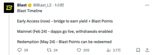 至于后续的时间规划,Blast 计划于明年 2 月 24 日上线主网并开发提款, 5 月 24 日开放 Blast Points 的「赎回」(原文用的 redeem,未详细解释)。