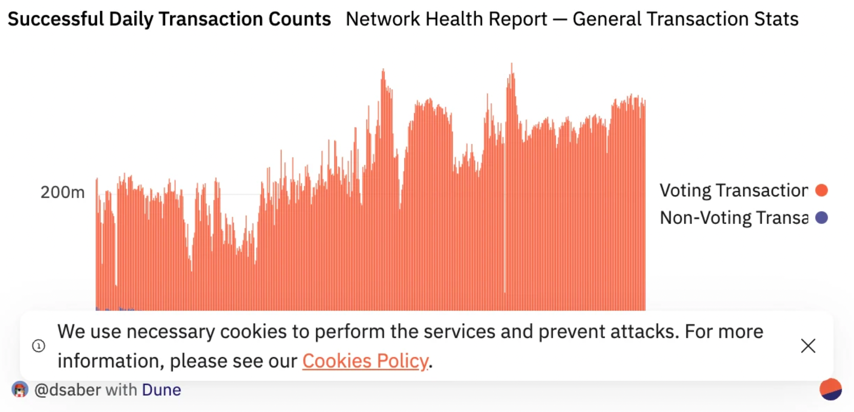 投票交易对于网络的运行是必要的,因为它们创建了区块链所依赖的去中心化共识。当验证者投票确认一个或多个提议的区块时就会发生投票交易。无投票权交易是由区块链上的用户行为触发的交易。例如,无投票权交易可能代表 NFT 铸造或用户将代币从一个钱包转移到另一个钱包。网络需要一定数量的投票交易才能达成共识,但随着时间的推移,我们希望看到投票与无投票交易的比例下降,因为随着网络效率的提高,投票交易的总体百分比应该会下降。
